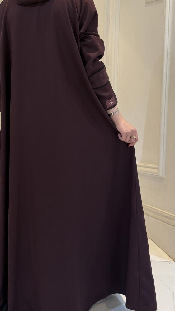 عباية بتصميم عصري يجمع بين الراحة والفخامة، تأتي بلون عنابي غامق وهادئ . مزينة بجيوب أمامية مخفيه بارزة ذات غطاء، وتحديد اطراف العباية بلون أسود لخلق تباين جذاب. مناسبة للإطلالات اليومية أو التنسيقات المسائية الراقية.