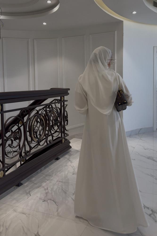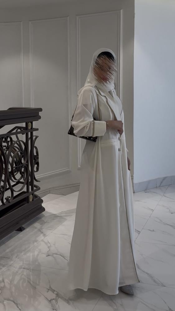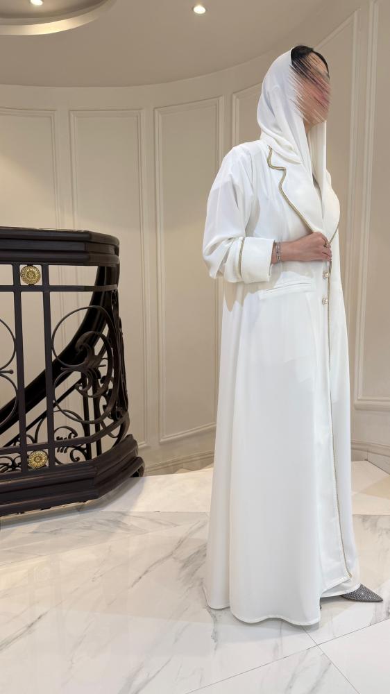 عباية أنيقة بتصميم عصري ولمسة فخمة، تأتي بلون أبيض ملكي يضفي حضورًا راقٍ ولافت. مزينة بأزرار ذهبية فاخرة على الجهة الأمامية تمنحها تميزًا إضافيًا، الأكمام بتفاصيل مطوية تضيف لمسة عصرية ناعمة. مثالية للمناسبات والاجتماعات الرسمية أو الإطلالات اليومية الراقية.