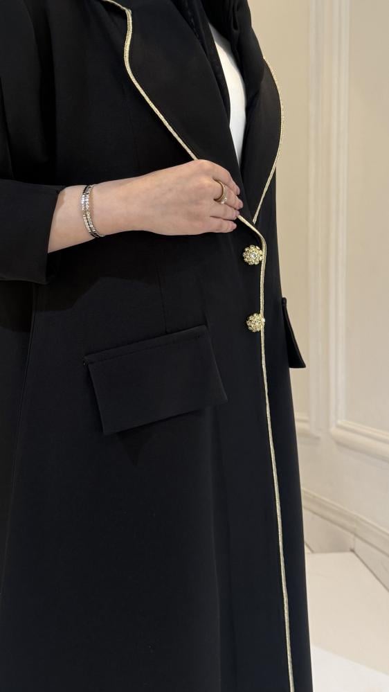 عباية فاخرة تجمع بين الكلاسيكية والرقي، بلون أسود أنيق مزين بخيوط ذهبية بارزة على الأطراف تمنحها لمسة لامعة ناعمة تعكس الفخامة. تصميم بياقة بارزة وزرين أماميين بتفاصيل ذهبية فريدة، مع جيوب جانبية تضيف لها طابع عملي وعصري في آن واحد.