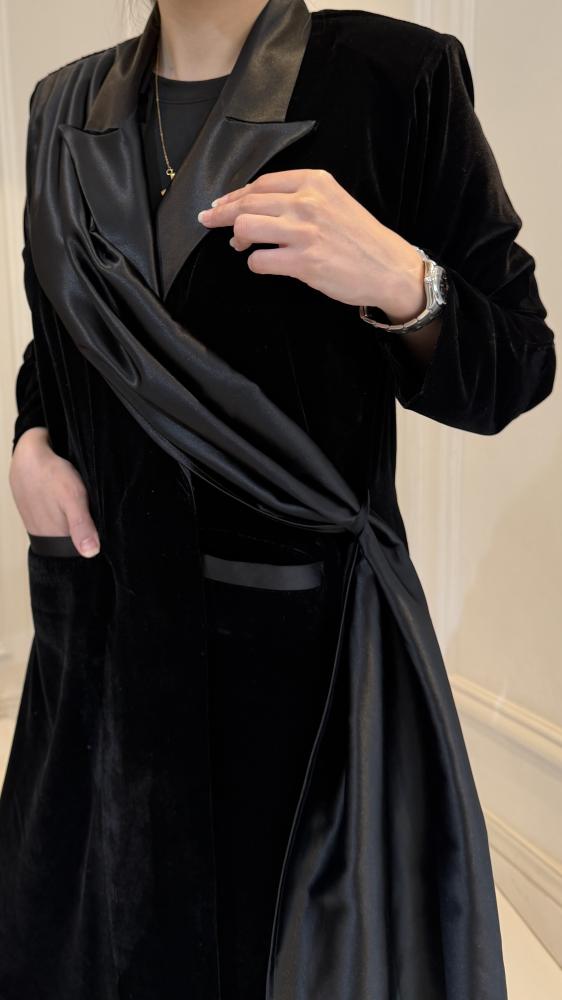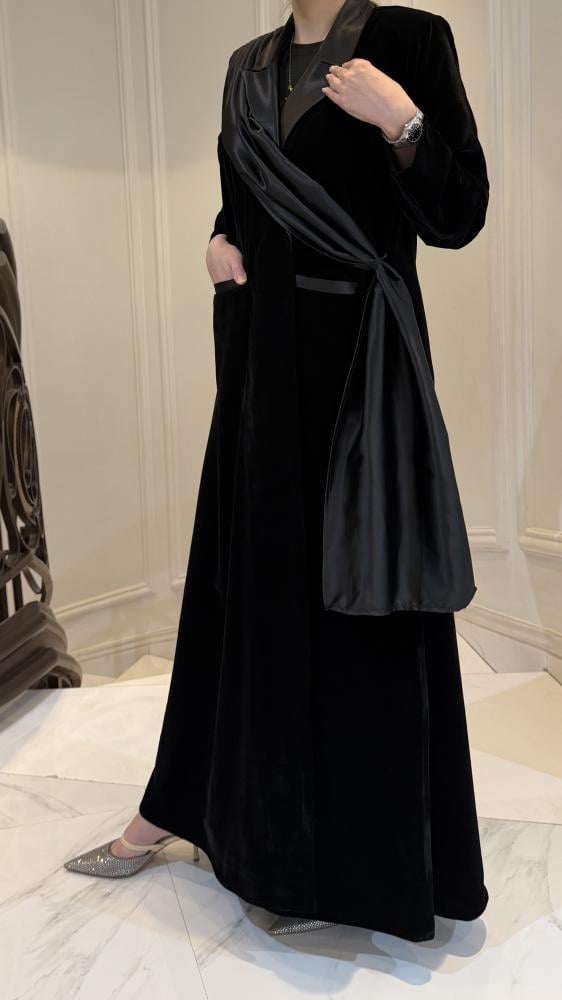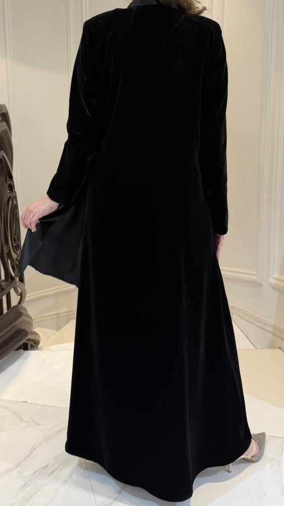 عباية 1997 بتصميم فاخر ، عباية تأتي بلون الأسود المخمل حيث يزينها من الأمام قماش تفته . تأتي العباية بقصة أنيقة وانسيابية تمنحك إطلالة راقية.